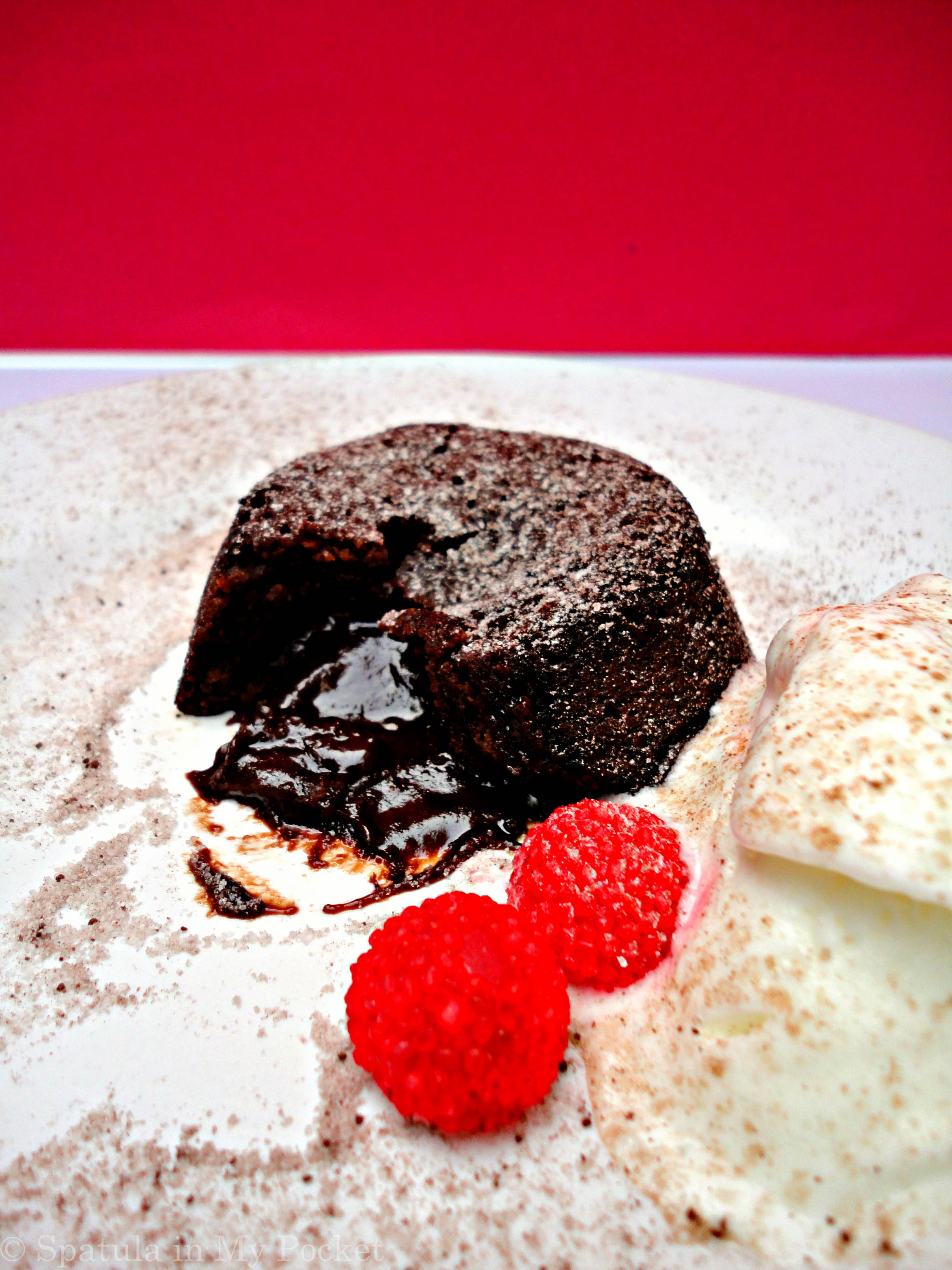 Stir in the egg mixture into the chocolate and then add the flour, mix well. Divide the batter among the prepared ramekins or a muffin tray and bake for 12 to 15 minutes, the edges should be firm and set but the center will still look a little wet.